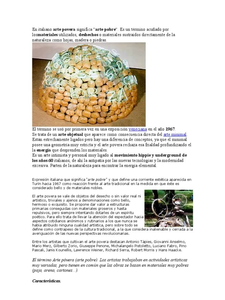 Arte povera) es un movimiento artístico surgido en italia en la segunda mitad de la década de 1960, al cual se adhirieron autores del ámbito predominantemente turinés. Fue llamado así por germano celant, debido a que se utilizan para su creación materiales humildes y pobres, generalmente no industriales (plantas, sacos de... Lunes 12 de octubre 09.13 gmt.